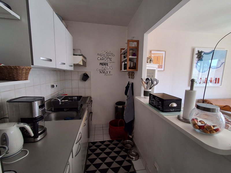 VUE SUR PARC- PLEIN SUD- A 600M DE LA PLAGE. Charmant duplex T2 bis situé au 3ème étage d'une résidence avec piscine: Entrée avec placard, séjour...