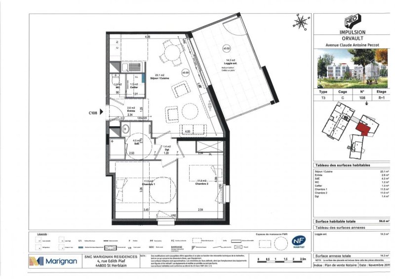 ORVAULT - QUARTIER FORUM D'ORVAULT, dans une résidence récente de 2022, appartement type 3 de 56.60 m² comprenant une entrée, un séjour donnant sur...