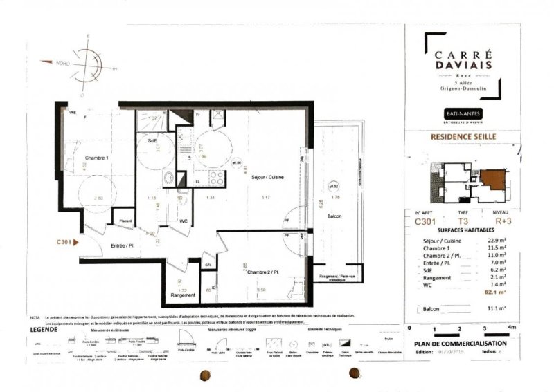 REZE, dans une résidence récente, un appartement Type 3 comprenant une entrée avec placard, un séjour donnant sur un balcon de 11.10m², une cuisine...