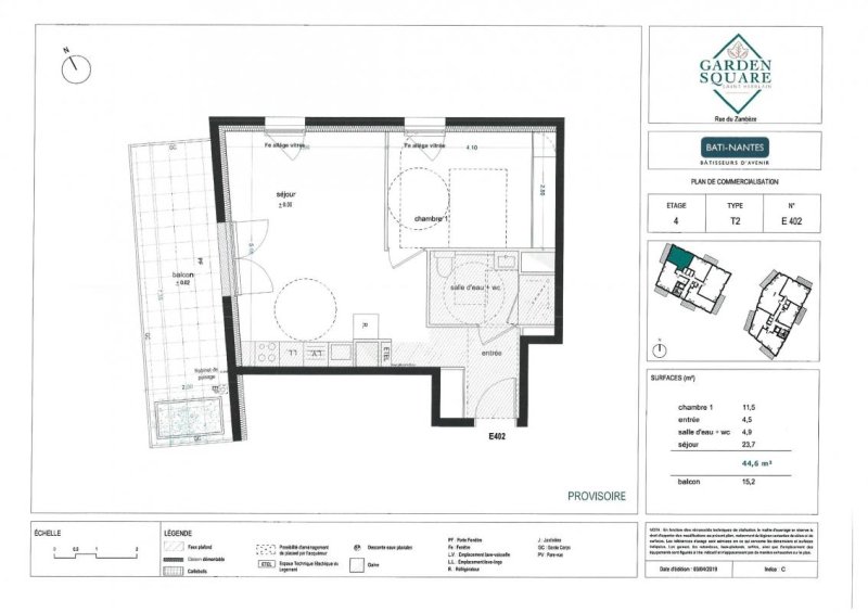 SAINT HERBLAIN - QUARTIER SOLVADIERE- Dans résidence BBC, T2 comprenant : Entrée avec placard, séjour de 17.88 m² donnant sur terrasse de 10.99 m²,...