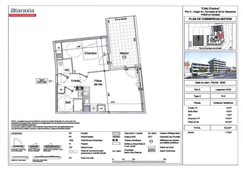 SAINT HERBLAIN, dans une résidence neuve, un appartement T2 comprenant : une entrée avec placard, un séjour donnant sur un balcon de 11.60m², une...