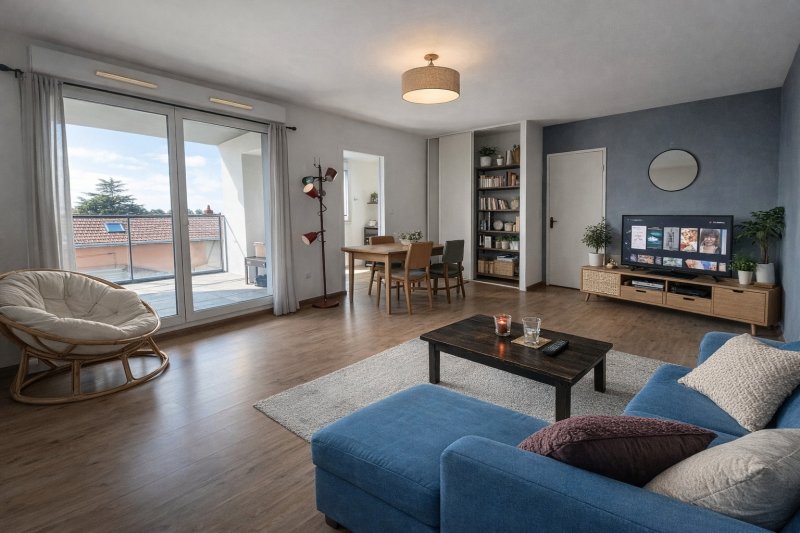 Pour offrir une meilleure projection, deux photos ont été retouchées avec ajout de mobilier (homestaging virtuel). Les murs, sols et plafonds...