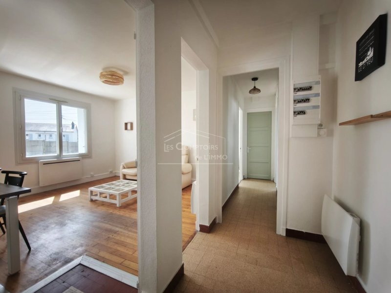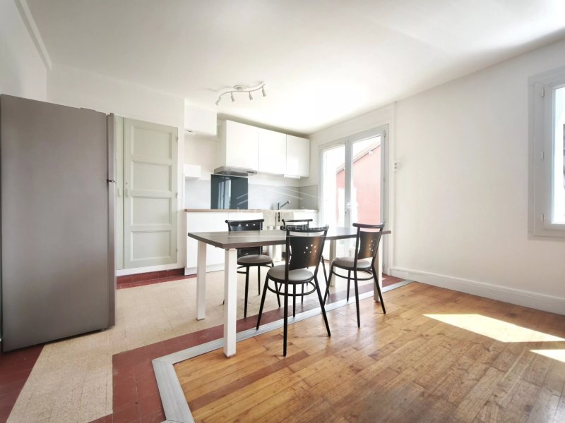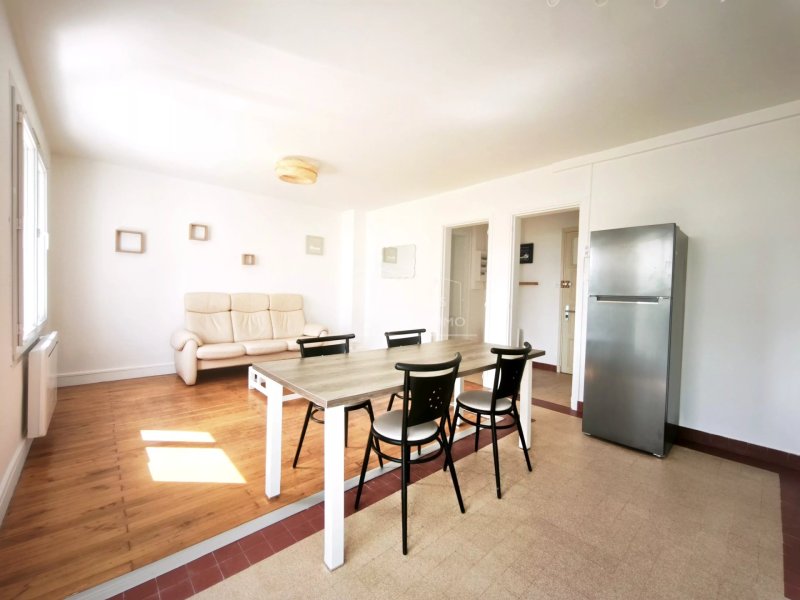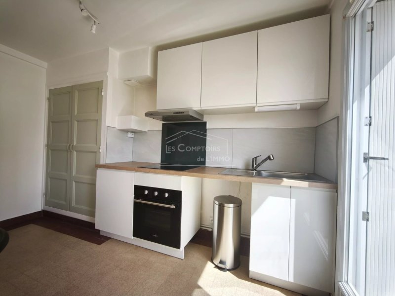 entrée, séjour/cuisine aménagée et équipée (plaque, hotte, four, frigo avec partie congélateur), deux chambres, salle de bains et WC indépendants.