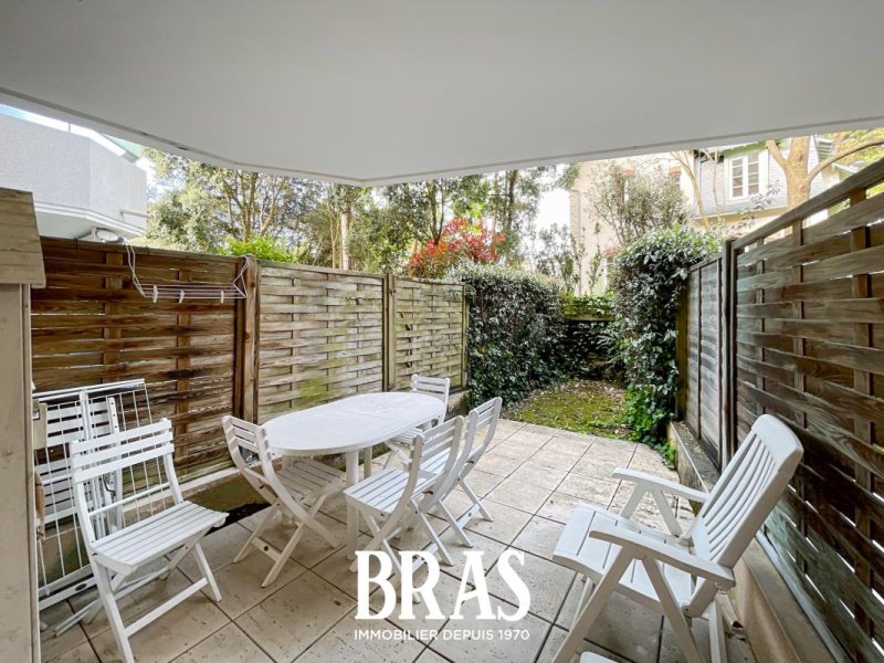 Une terrasse avec jardinet. Une place de parking extérieure.