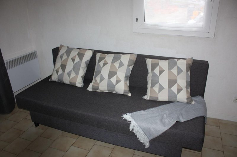 Equipement : Canapé lit, Armoire penderie, étagère, Table avec 2 chaises, réfrigérateur, four - micro-onde, plaques électriques, vaisselle, linge de lit, etc.