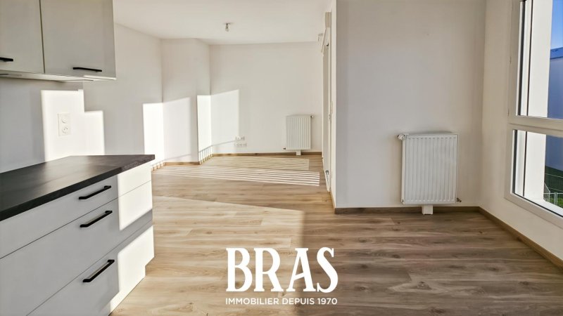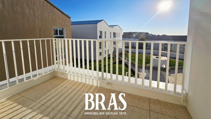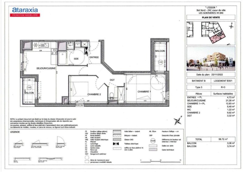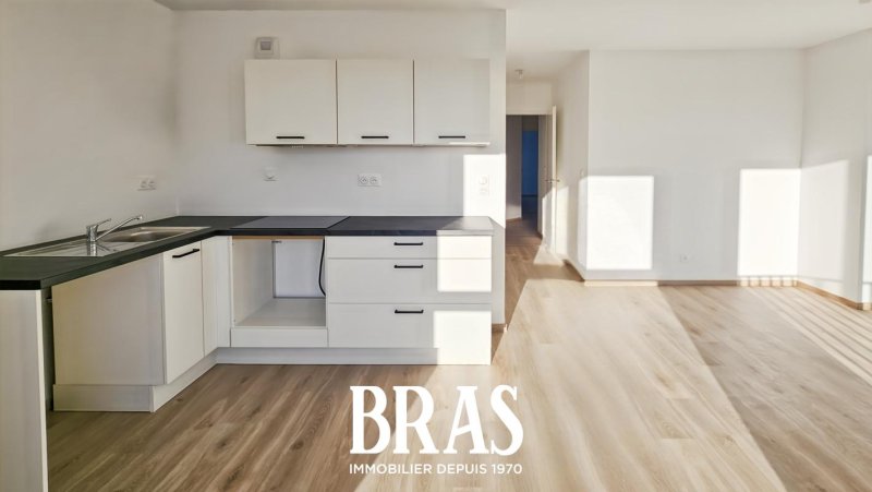 Appartement récent 3 pièces de 58.72 m² situé au 3ème étage avec ascenseur et comprenant entrée avec placard, séjour avec espace cuisine aménagé et équipé (plaques de cuisson induction et hotte) de 21.30 m² donnant sur un balcon de 3.36 m², dégagement, salle d'eau, WC, une première chambre avec placard de 12.83 m² donnant sur un balcon de 3.74 m², une deuxième chambre de 9.92 m²