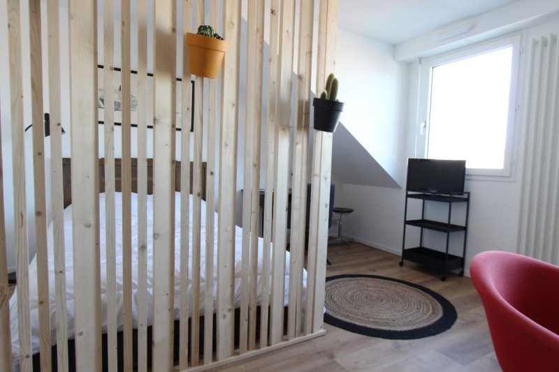 BELLE PIECE DE VIE - Espace nuit séparé par des claustras bois, lit 2 places, grand placard - Espace salon : canapé, fauteuils, petite table de séjour, table bureau, TV.