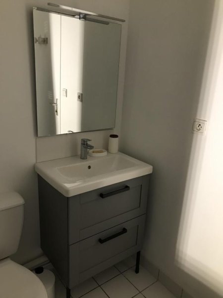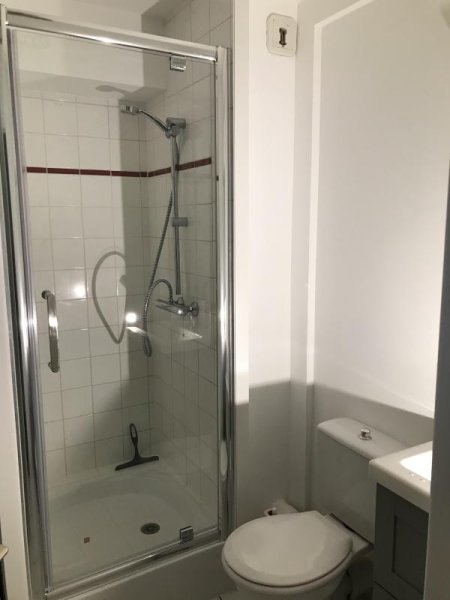 SALLE D'EAU : douche, sèche serviettes, meuble avec vasque, meuble de rangement, lave-linge, WC.