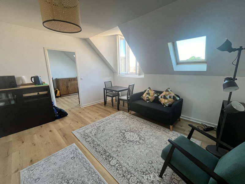 Le logement se compose d'une pièce de vie lumineuse avec canapé, rangements et table à manger, d'un coin kitchenette équipé (plaques de cuisson, réfrigérateur, micro-ondes), d'une salle d'eau et d'un WC privés sur palier.