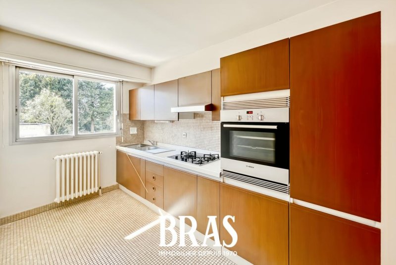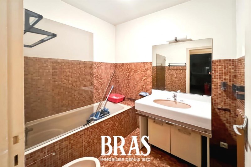 Dans une résidence sécurisée, agréable appartement de type 2 de 62.7m² situé au 1er étage avec ascenseur donnant côté jardin, comprenant : une entrée avec placard, dégagement, pièce de vie avec placard donnant sur un balcon, cuisine aménagée et équipée (plaques de cuisson, hotte et four), chambre avec placard, une salle de bains avec baignoire et meuble vasque, WC séparés.