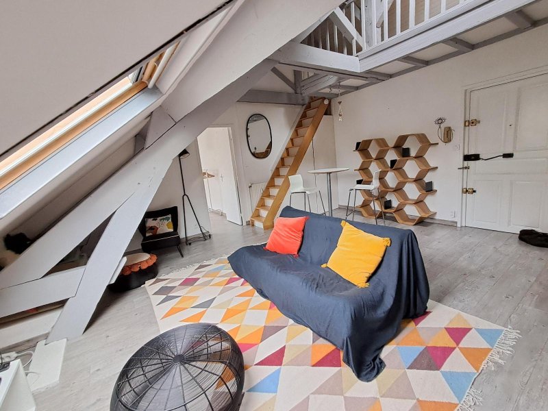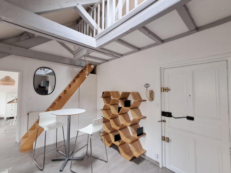Un appartement meublé de 32.95m² en loi Carrez et 64m² au sol, au 2ème et dernier étage, comprenant : une pièce de vie avec coin cuisine aménagé, une chambre, une mezzanine, une salle d'eau et un WC.