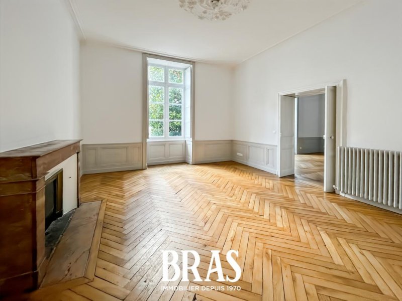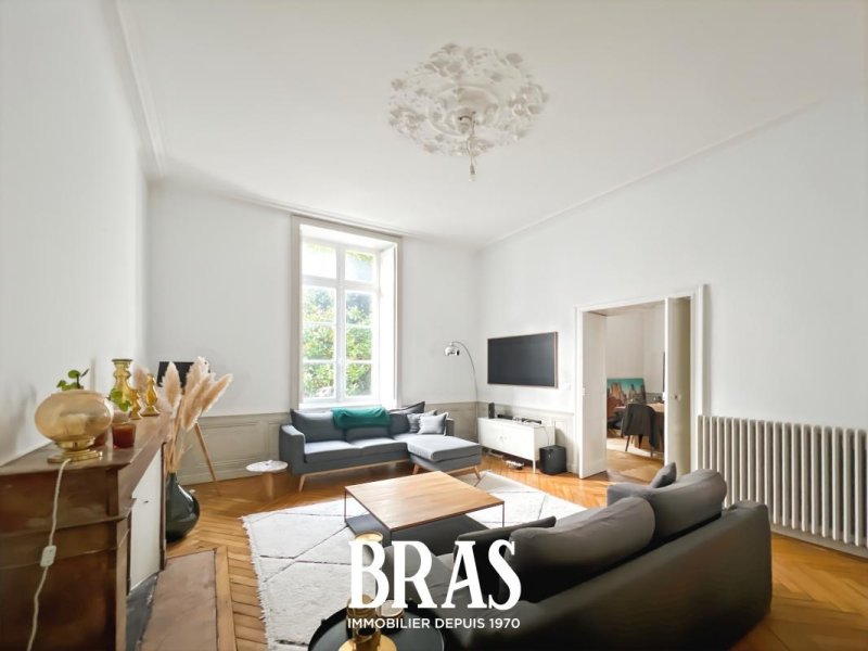 Dans un immeuble de caractère, bel appartement de type 3 de 115.92m² situé au 1er étage avec ascenseur et comprenant : une vaste entrée, un séjour de 26m², un salon de 28m² (possibilité de faire une chambre), une cuisine séparée aménagée et équipée (plaques vitro céramiques, hotte, et four), 1 chambre de 17m², une buanderie, une salle d'eau avec douche et meuble vasque, un WC séparés.