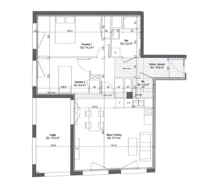 Une entrée avec placard , un séjour donnant sur une loggia de 12.50m² , une cuisine ouverte, deux chambres dont une avec placard, une salle d'eau avec wc.