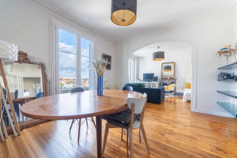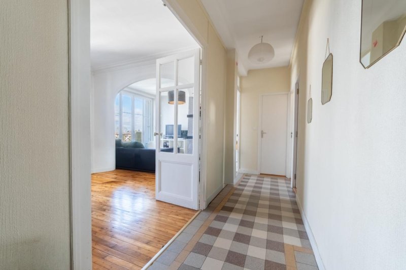 Au 5ème et dernier étage avec ascenseur d'un immeuble de 1930, T4 en parfait état, très ensoleillé offrant : vaste entrée, double réception sur parquet donnant sur beaux balcons, 2 chambres avec rangements, cuisine aménagée, salle de bains, salle d'eau, WC. Une cave et un grenier. Local vélos.