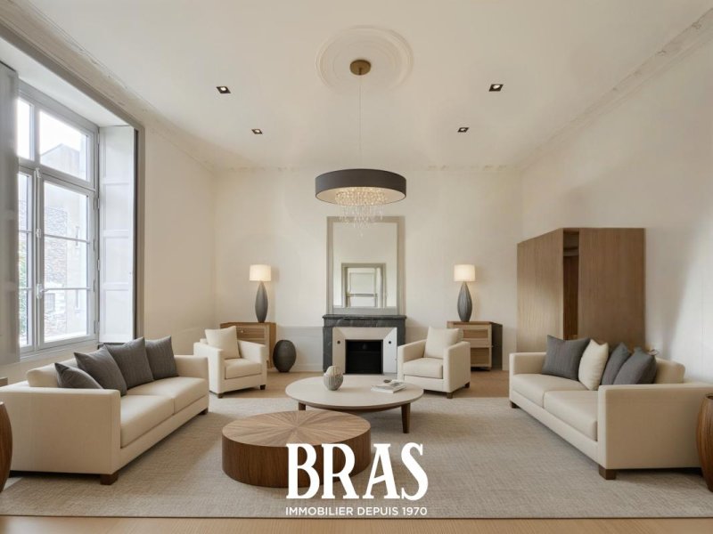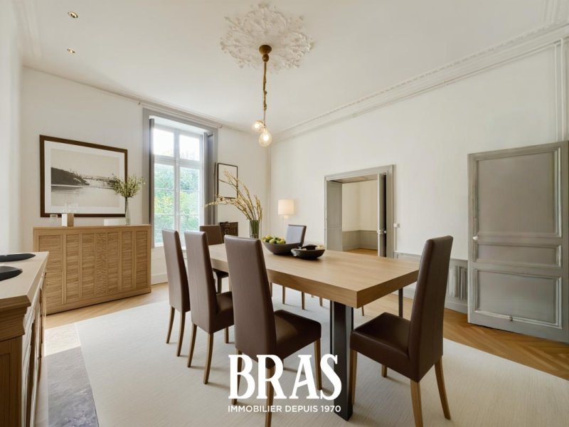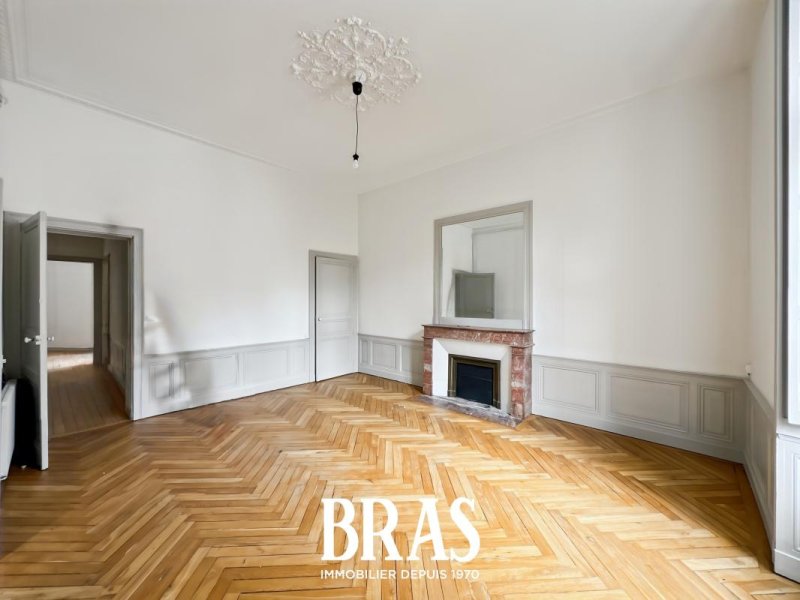 Impasse Saint Laurent. Dans un immeuble de caractère, bel appartement de type 6 de 189.09m² situé au 2er étage avec ascenseur et comprenant : une vaste entrée, un séjour de 26m², un salon de 28m² (possibilité de faire une chambre), une cuisine séparée aménagée et équipée (plaques vitro céramiques, hotte, et four), 1 chambre de 17m², une buanderie, une salle d'eau avec douche et meuble vasque, un WC séparés.