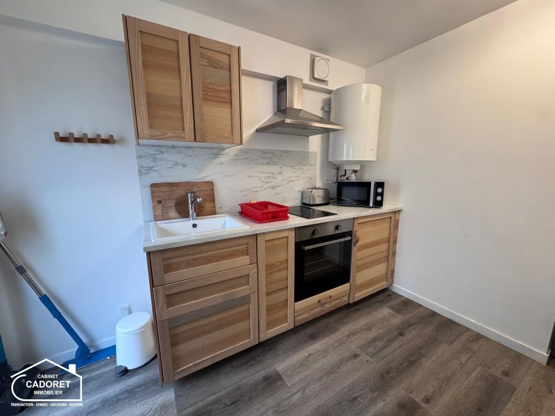 Studio meublé - 15 m² PORNIC - Le cabinet CADORET Immobilier vous propose : A Pornic, un studio meublé de 15m² en rez-de-chaussée comprenant une entrée desservant sur la pièce principale avec une cuisine aménagée et équipée (hotte, plaques, four, micro-ondes et réfrigérateur) et une salle d'eau avec WC. LOYER : 450.00€ hors charges - DÉPÔT DE GARANTIE : 900.00€ - HONORAIRES : 150.00€ dont 45€ pour l'état des lieux d'entrée. LIBRE.