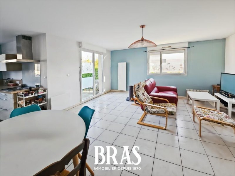 Appartement de type 3 d'environ 70m² situé en rez-de chaussée comprenant une entrée de 5.71m² avec placard, un séjour avec cuisine aménagée et équipée d'une plaque de cuisson, d'une hotte et d'un micro-onde de 33.41m² donnant sur une terrasse et un grand jardin, deux grandes chambres de 12.15m² et 11.30m² avec placards, une salle d'eau et WC séparé. Vous aurez accès à un cellier de 3m².