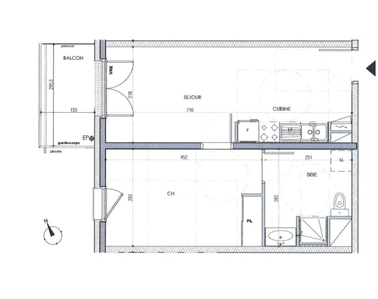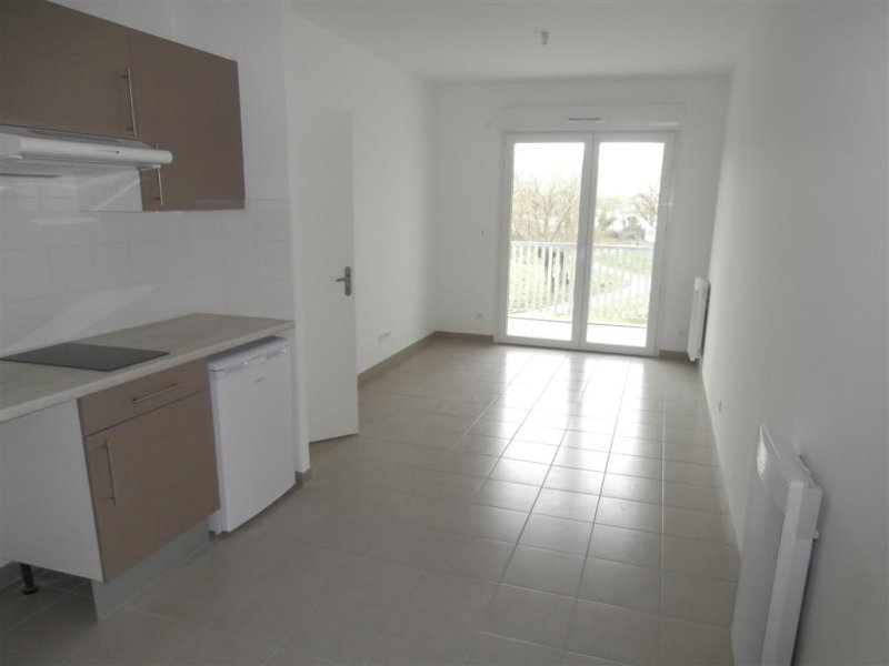 ST HERBLAIN - QUARTIER PELOUSIERE, dans résidence BBC, type 2 comprenant : un séjour carrelé avec coin cuisine aménagé et équipé (plaques vitrocéramiques, frigo et hotte) donnant sur balcon de 4.58m², 1 chambre sur parquet avec placard aménagé, sde avec wc. Parking extérieur.