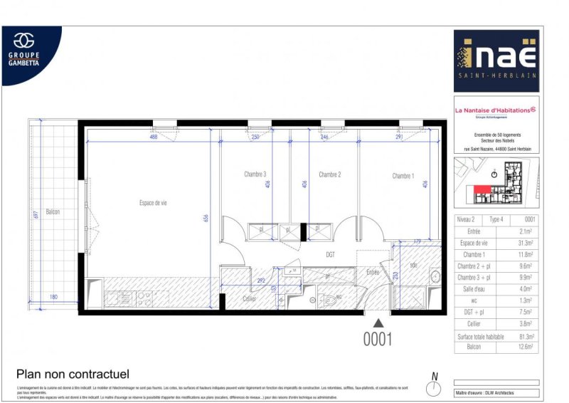 SAINT-HERBLAIN. Dans une résidence neuve, idéalement situé a proximité des transportes et des commerces, découvrez ce lumineux appartement T4 de 81,3 m², situé au 2ème étage. Ce bien comprend un vaste espace de vie de 31,3 m², un coin cuisine aménagée et équipée (meuble bas pour emplacement four, 2 meubles hauts 1 porte, niche pour micro-ondes, 1 plaque induction 4 zones, 1 hotte), trois chambres (dont deux avec placards), une salle d'eau, un WC, et un cellier, le tout complété par un agréable balcon de 12,6 m². Deux places de parking complètent ce bien. PAS D'HONORAIRES DE LOCATION. ATTENTION aux conditions de ressources : Logement Locatif Intermédiaire. « Les informations sur les risques auxquels ce bien est exposé sont disponibles sur le site Géorisques : www.georisques.gouv.fr »