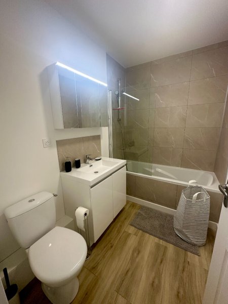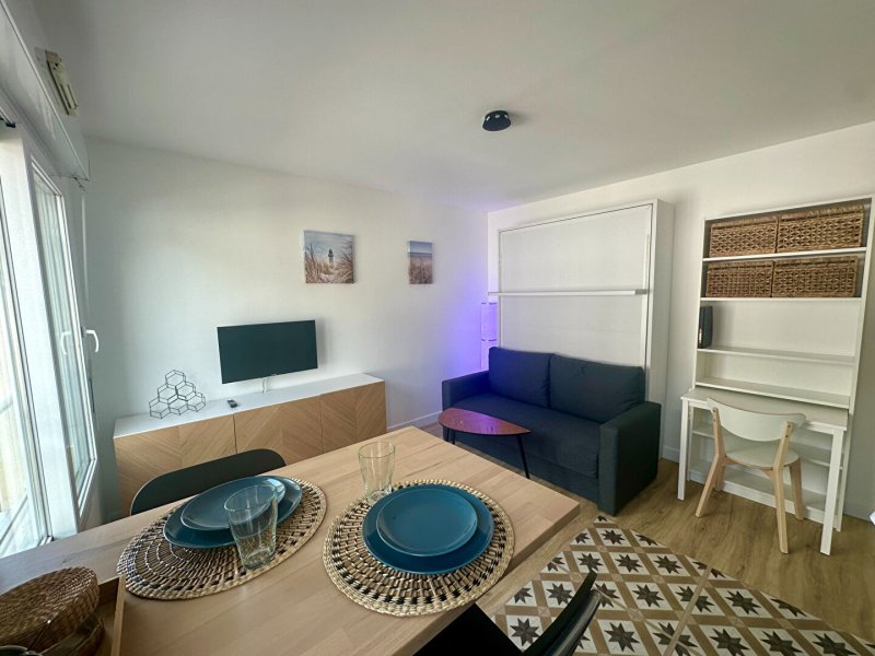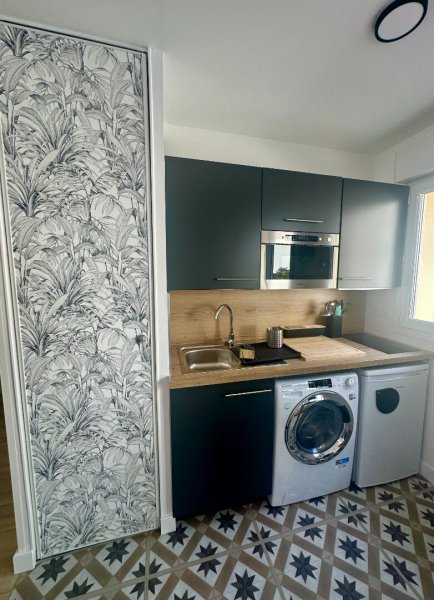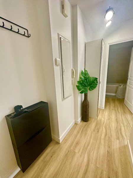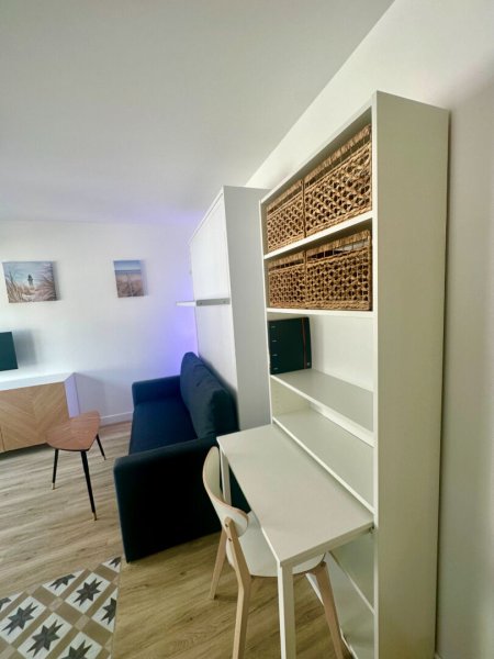 Très joli studio rénové avec goût comprenant une entrée avec placard à chaussures et penderie, une salle de bains avec WC, une pièce de vie avec bureau, télévision, canapé et lit escamotable. Pour finir, un coin cuisine aménagée et équipée (plaques, hotte, four micro-ondes, réfrigérateurs top, machine à laver / sèche-linge).