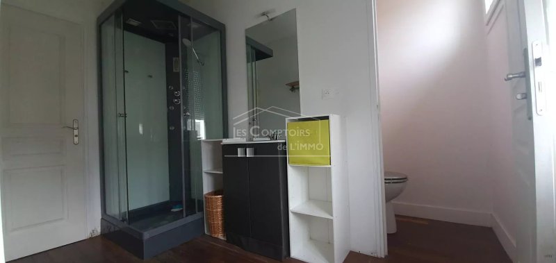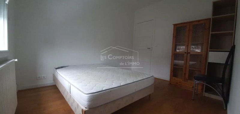 Au 1er étage d'une maison avec jardin privatif, comprenant séjour, cuisine aménagée et équipée (plaque, hotte, four, réfrigérateur, micro-onde), une salle d'eau, toilettes séparées, deux chambres.