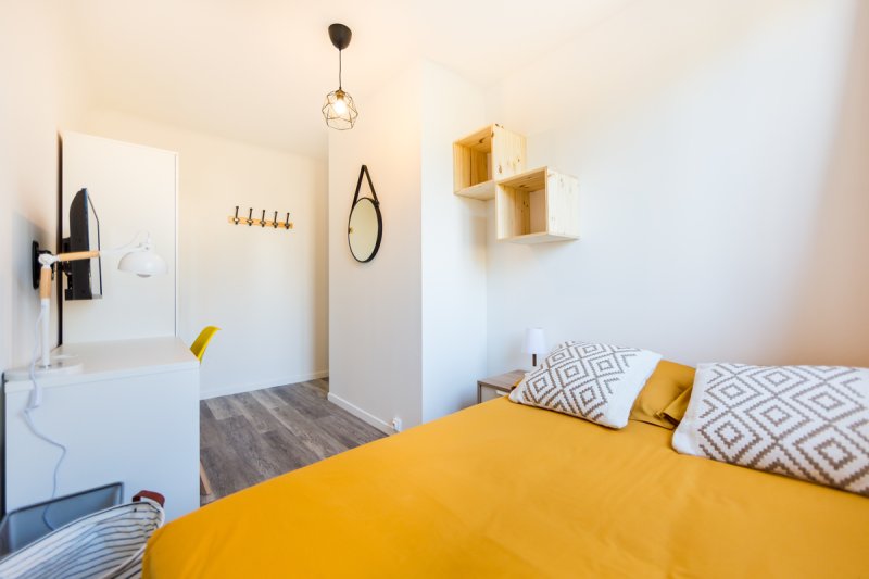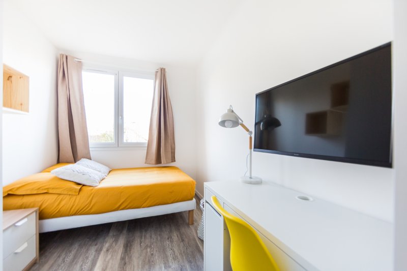 La chambre proposée est prête à t'accueillir. Elle dispose d'un lit double avec linge fourni, d'un bureau pour travailler ou étudier, d'une penderie spacieuse ainsi que d'une télévision.