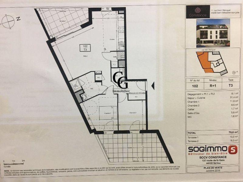 Saint Sébastien sur Loire - Appartement T3 d'une surface habitable de 70m² au 1er étage avec ascenseur. Il se compose d'un séjour avec une cuisine ouverte aménagée et équipée (plaque de cuisson et hotte) donnant sur une terrasse de 10,20m², d'un cellier, de deux chambres donnant sur une 2ème terrasse de 18m², d'une salle d'eau et d'un wc. Un garage Box. Libre le 23 octobre 2025. Loyer : 768.23 + 100 de provision pour charges (taxe d'ordures ménagères et entretien des parties communes). Le bien est soumis à la Loi Pinel. Honoraires de 768 TTC à la charge du locataire comprenant 210 TTC pour l'état des lieux. Loyer de base 768 /mois. Provision sur charges 100 /mois, régularisation annuelle. Dépôt de garantie 768 . Classe énergie C, Classe climat C Montant estimé des dépenses annuelles d'énergie pour un usage standard : entre 540.00 et 760.00 sur les années 2021, 2022 et 2023 (abonnements compris). Les informations sur les risques auxquels ce bien est exposé sont disponibles sur le site Géorisques : georisques.gouv.fr.