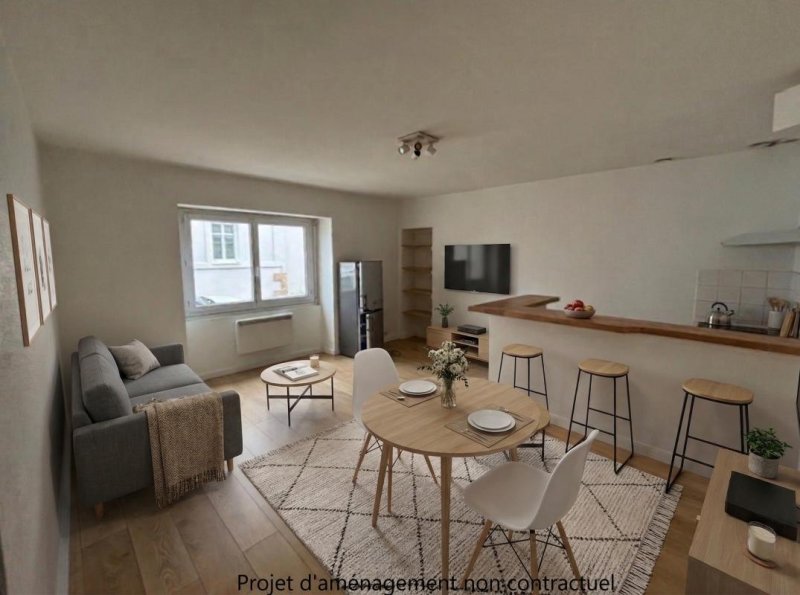 NANTES - QUARTIER STE ANNE, dans petit collectif au coeur de la Butte Ste Anne, à proximité des commerces de proximité, appartement type 2 comprenant une entrée, un séjour sur parquet avec cuisine ouverte aménagée et équipée de plaques 4 feux, hotte et frigo top, le tout séparé par un meuble bar, une chambre sur parquet, une salle de bain avec wc.