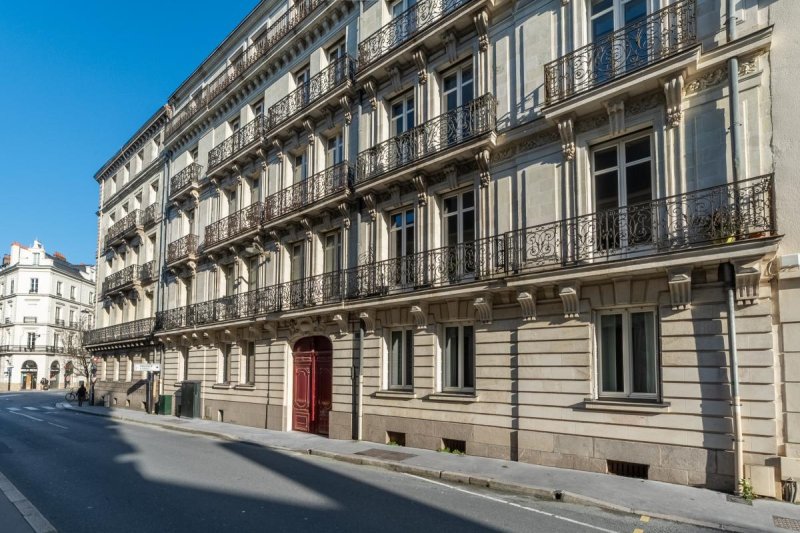 Nantes Graslin, au 1er étage sur superbe cour pavée d'un immeuble haussmannien en cours de ravalement, beau T3 de caractère en excellent état offrant réception avec cuisine équipée ouverte (plaques gaz, four et hotte) et mur en pierre apparentes, 2 grandes chambres avec placard et salle d'eau avec WC. Un local vélos, une cave et un grenier complètent ce bien de qualité.