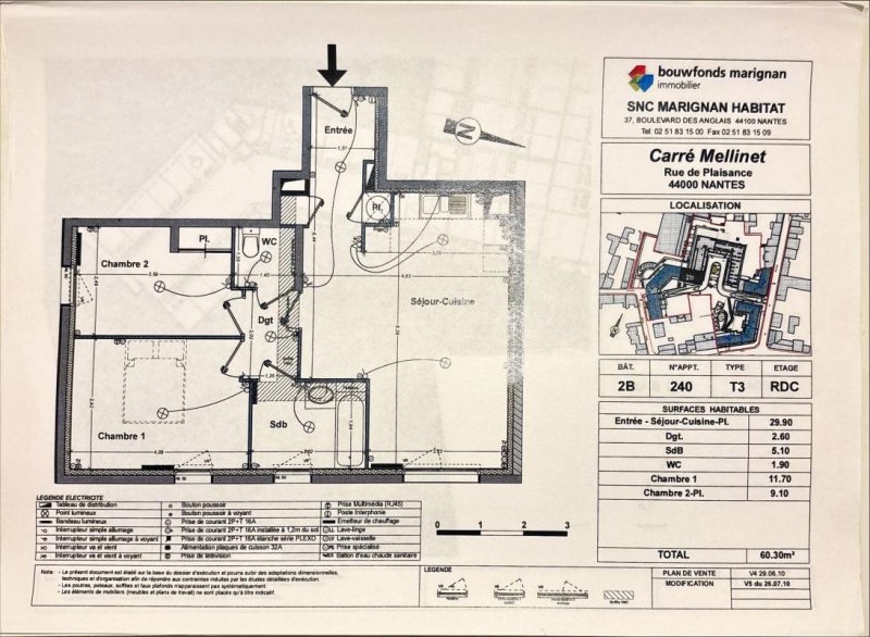 NANTES - QUARTIER MELLINET, Dans une résidence récente de 2012, appartement ensoleillé au rez de chaussée, dans une copropriété en retrait de la rue, au calme et avec des espaces verts. Spacieux séjour avec cuisine ouverte aménagée et équipée (hotte et plaques), deux chambres dont une avec placard, salle de bains et wc séparés. Un local vélo ou box particulier en annexe. Une place de stationnement complète le bien. Accès idéal pour le centre ville et vie de quartier agréable. Logement soumis à l'assurance Garantie Loyers Impayés. « Les informations sur les risques auxquels ce bien est exposé sont disponibles sur le site Géorisques : www.georisques.gouv.fr »