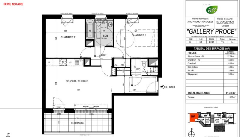 Boulevard Paul Chabas - Dans une résidence récente, à proximité immédiate du Parc des Dervallières et du Parc de Procé, appartement de type 3 de 61,31m² situé au 1er étage avec ascenseur et comprenant : entrée avec placard, séjour de 27,24m² avec cuisine aménagée et équipée (plaque de cuisson vitrocéramique et hotte), donnant sur une terrasse de 8,93m² exposée Sud, dégagement, 2 chambres de 13,50m² et 10,13m² dont une avec placard, une salle de bains avec baignoire et meuble vasque, WC séparés avec coin buanderie.