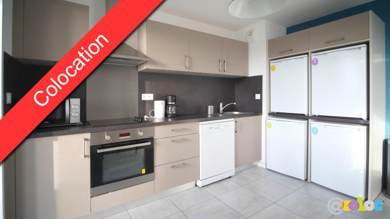 Cuisine tout équipée : plaques induction, four, réfrigérateurs (un par colocataire), petit électroménager, vaisselle et ustensiles