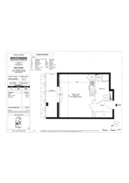 Dans une résidence au calme, appartement de type 1 de 29,50m² situé au rez-de-chaussée et comprenant : entrée avec placard, pièce de vie de 20,50m² avec cuisine aménagée et équipée (plaques vitrocéramiques, hotte et réfrigérateur table-top), donnant sur terrasse de 6,70m² exposée Sud, une salle d'eau avec douche, meuble vasque et WC.