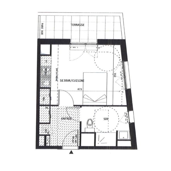 NANTES - SAINT JOSEPH DE PORTERIE. Dans une résidence BBC, studio de 37.75m² comprenant : une entrée avec placard, un séjour donnant sur une terrasse de 6 m², une cuisine ouverte aménagée et équipée de plaques, d'une hotte et d'un frigo, une salle d'eau avec wc.