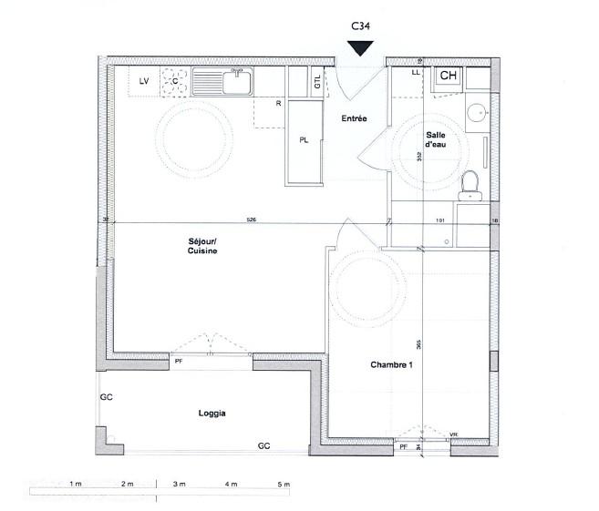 A LOUER - NANTES PORTERIE - Appartement T2 43.25 m² - Au 3eme étage, appartement T2 de 43,25m² comprenant, une entrée avec placard, une salle d'eau, un séjour avec cuisine donnant sur une loggia de 6,80m², et une chambre. Place de parking en sous-sol. Chauffage et eau chaude : individuel au gaz.