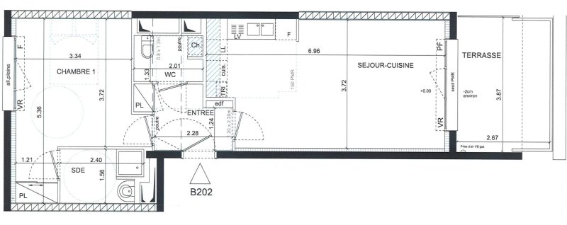 NANTES - QUARTIER BOTTIERE. A proximité de l'arrêt Souillarderie (ligne 1) du tramway, dans résidence récente BBC, type 2 comprenant une entrée avec placard, un séjour de 24m² donnant sur une terrasse de 10m², cuisine ouverte aménagée et équipée (plaques, four, hotte), une chambre avec placard, une salle d'eau attenante, wc. Parking couvert.