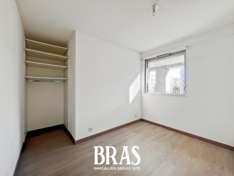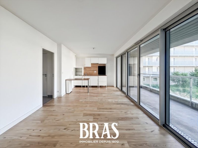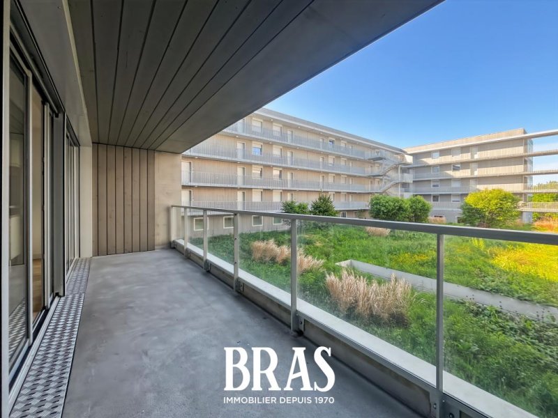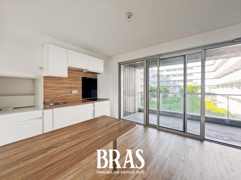 Dans une résidence de 2019, au 2ème étage avec ascenseur, un appartement de type 3 de 55.26 m² comprenant : Une pièce de vie avec cuisine aménagée et équipée (plaque de cuisson et hotte) donnant sur un balcon de 11.57 m², deux chambres de 10.84 m² et 9.73 m², une salle d'eau avec une douche, meuble vasque et WC séparés.