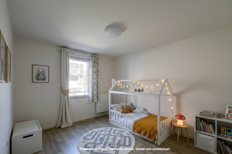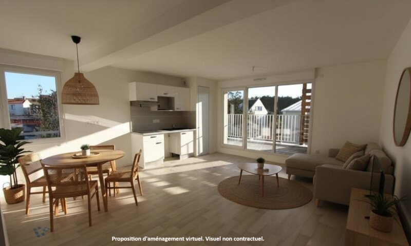 BOUGUENAIS, dans une résidence de 2022, type 3 comprenant : une entrée avec placard, un séjour donnant sur un balcon sur l'arrière au calme, une cuisine ouverte aménagée et équipée d'une hotte et de plaques, deux chambres, une salle de bains, wc séparés. Deux parkings couverts. Conditions de ressources Loi Pinel