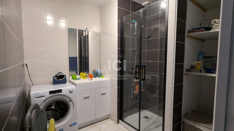 Situé au premier étage, avec une entrée indépendante en extérieur, il comprend une pièce de vie lumineuse avec placard, une cuisine ouverte aménagée et équipée d'une hotte / piano / lave-vaisselle et de nombreux rangements, un dégagement desservant une salle d'eau et deux chambres.