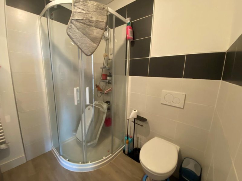 Appartement en duplex comprenant une entrée par le séjour avec cuisine aménagée/équipée (four, plaque et hotte) et placard, wc séparés. A l'étage, un palier avec placard desservant 2 chambres et une salle d'eau avec wc. Cave privative.