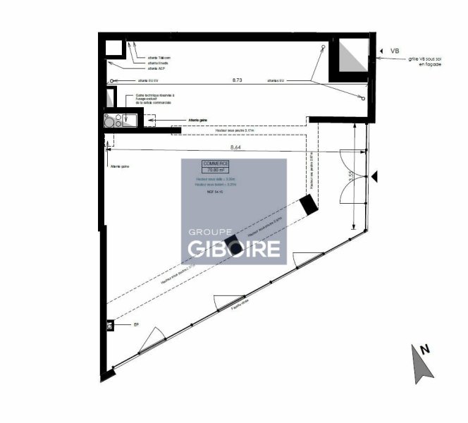 Belle visibilité de ce local disponible d'environ 71 m² situé Angers Nord, avec plus de 13 mètres linéaires de vitrines, 3 ouvrants oscillant battant et une double porte d'accès PMR donnant sur la rue. Local tout commerce : Restauration, alimentaire, tertiaire ou services, paramédical ou médical. Compteur Triphasé déjà installé ainsi qu'une Extraction de 400 x 400 partant en toiture et une deuxième extraction additionnelle de 300 x 300 partant elle-aussi en toiture. Local brut de béton, fluides en attentes, avec possibilité de prise en charge par le bailleur d'aménagement (Chape, doublage mur prépeint blanc, faux-plafond dalles 600x600 sur ossature métallique, sanitaire et lave-main, radiateurs, tableau électrique, prises secteurs et lumières) sous conditions.