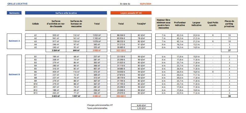 Ces locaux sont modulables et divisibles à partir d'environ 257m², pour une surface totale de 8 045 m². Chaque cellule dispose de parkings privatifs, bureaux aménagés et climatisés, grande hauteur libre dans l'entrepôt et quais de déchargement sur certaines cellules.