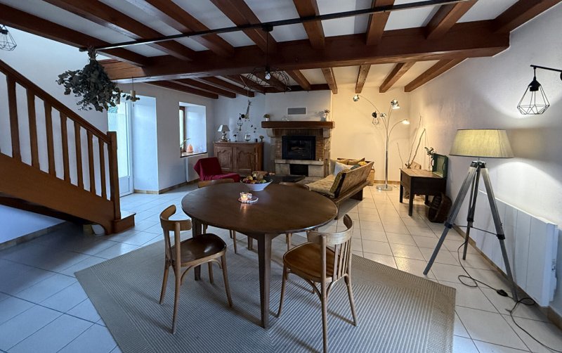 Composée d'une entrée avec placards, d'une pièce de vie avec cheminée insert , un coin cuisine aménagée ( non équipée), un WC.