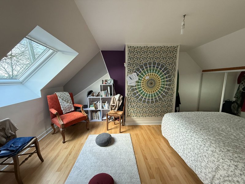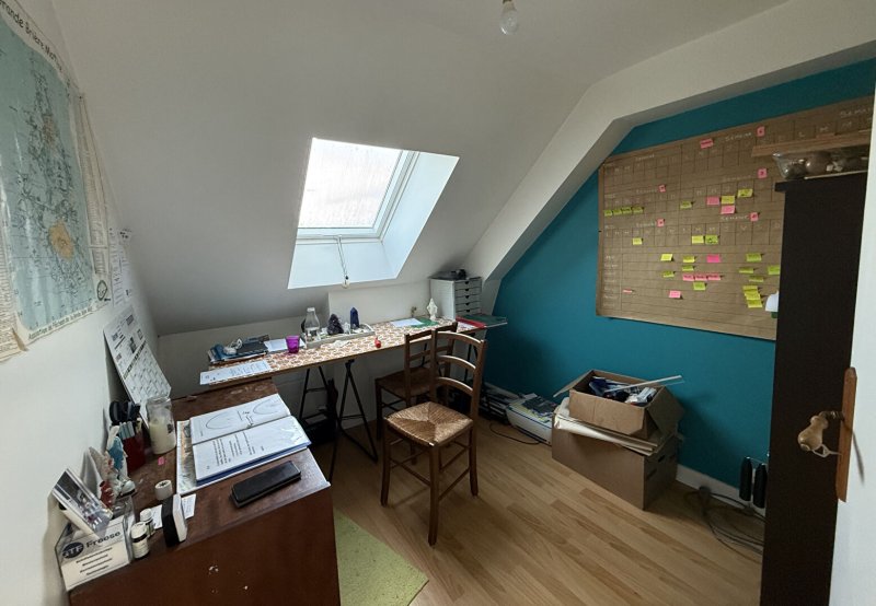 A l 'étage : un palier qui dessert deux chambres dont une avec placards, un bureau, une salle d'eau avec WC.