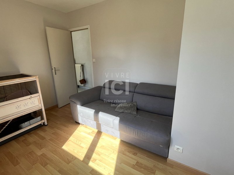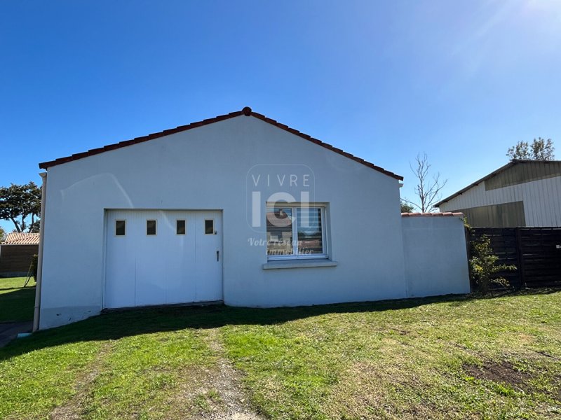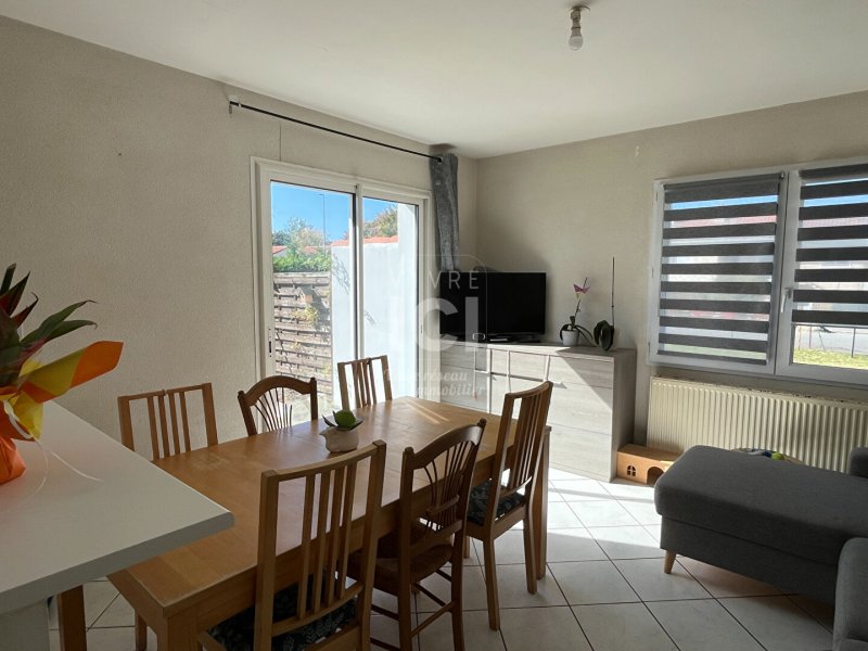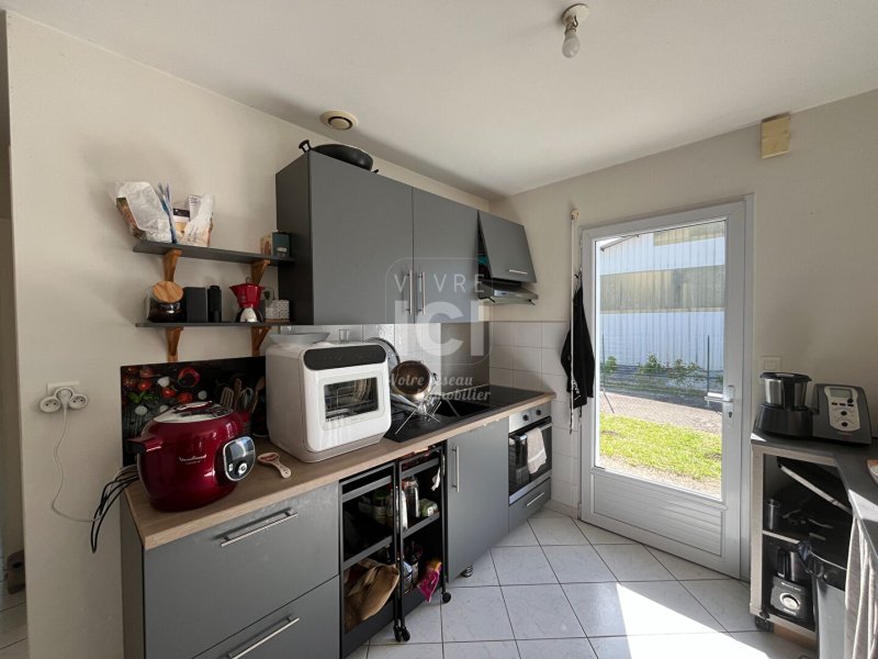 Maison T3 (56m²) - Une entrée par le garage sur une pièce de vie lumineuse donnant sur une cuisine aménagée et équipée (plaque de cuisson, four, hotte).