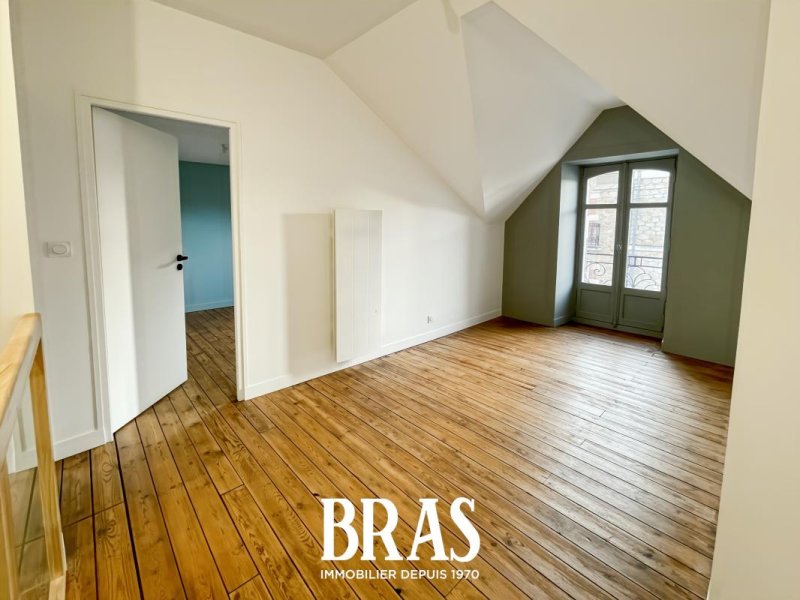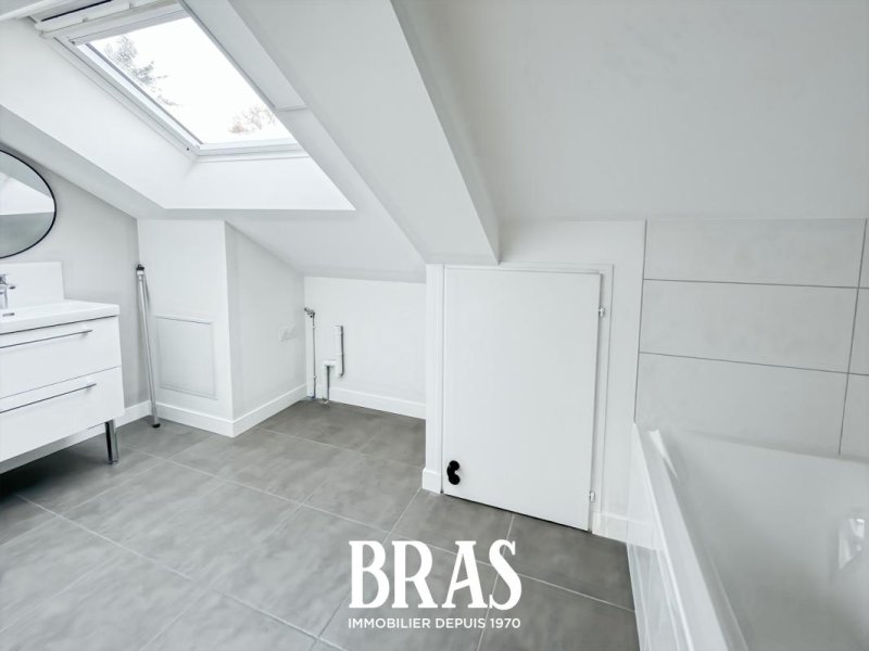 À l'étage: 3 chambres sous combles de + de 9 m² (entre 12.70 et 15 m² au sol), une salle de bains avec baignoire et meuble vasque, WC séparés, grand palier pouvant faire office de bureau ou bibliothèque.