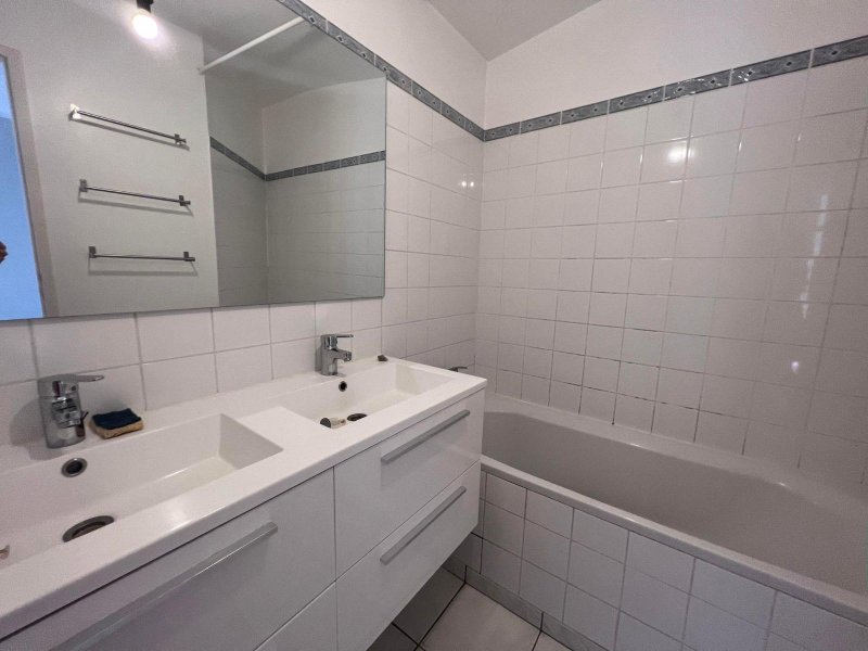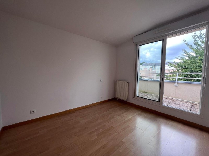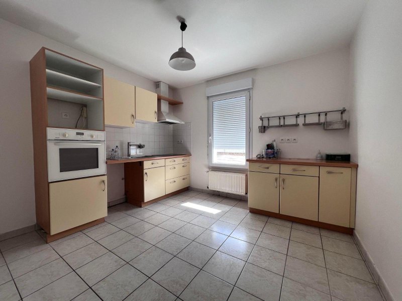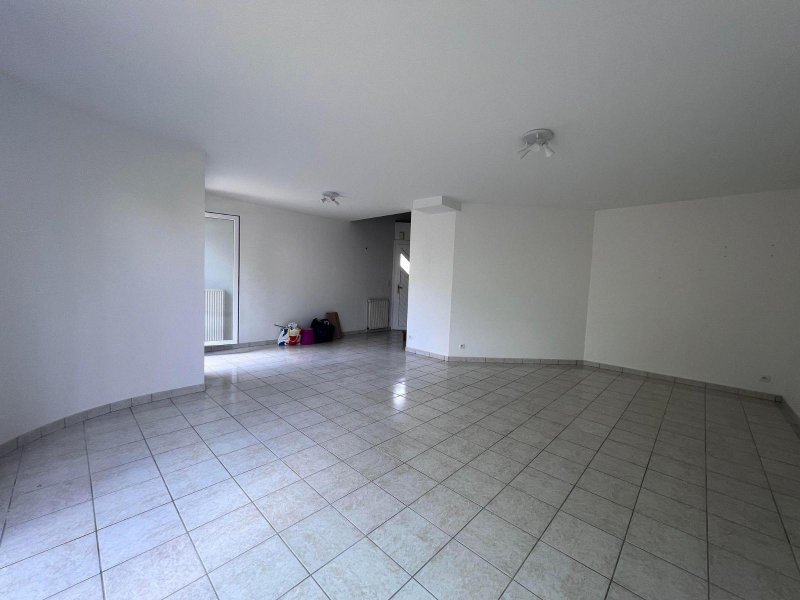 Maison T5 à louer - Maison comprenant au rez-de-chaussée : entrée, placard, cuisine aménagée et équipée (plaques vitrocéramiques, four, hotte), salle de séjour, WC. A l'étage : dégagement, mezzanine avec une chambre qui donne sur une terrasse, deux autres chambres, salle de bains, WC.