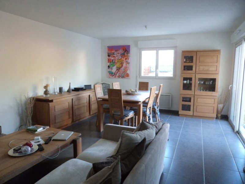 Belle maison de 2011 à louer comprenant au RDC une entrée, pièce à vivre avec cuisine ouverte aménagée et équipée (four, plaques vitrocéramiques et hotte) donnant sur terrasse et jardin, une chambre avec dressing, sde avec wc, lingerie et garage avec porte motorisée. A l'étage : une mezzanine, sdb, wc indépendants, deux chambres.