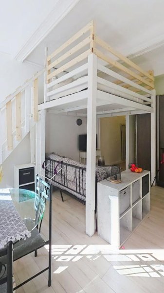 Studio en centre ville de draguignan dans un immeuble ancien. il est au 1ère étage. Pièce principale avec cheminée, haut de plafon où le coin coucher est instalé. Cuisine ouverte sur le séjour. Salle de douches.