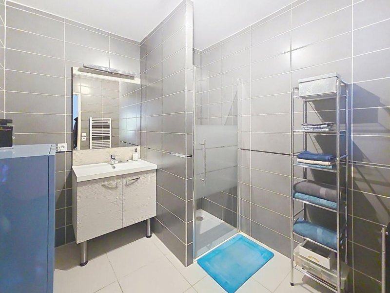 Le coin nuit compend deux chambres, dont une avec armoire intégrée, ainsi qu'une salle d'eau avec douche à l'italienne, vasque et sèche serviette.